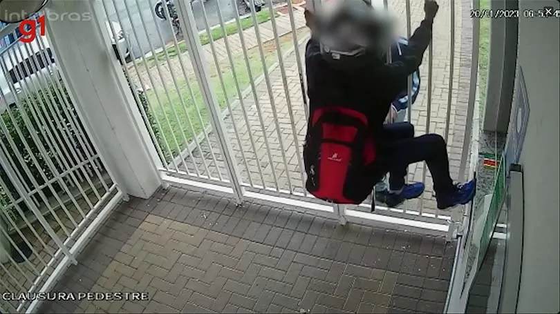 Nas imagens, a mulher entra na portaria, o assaltante consegue segurar o portão e rouba a bolsa. Em seguida, ele entrega os pertences para o comparsa, que o aguardava em uma motocicleta do lado de fora do condomínio, e pula a grade da portaria.